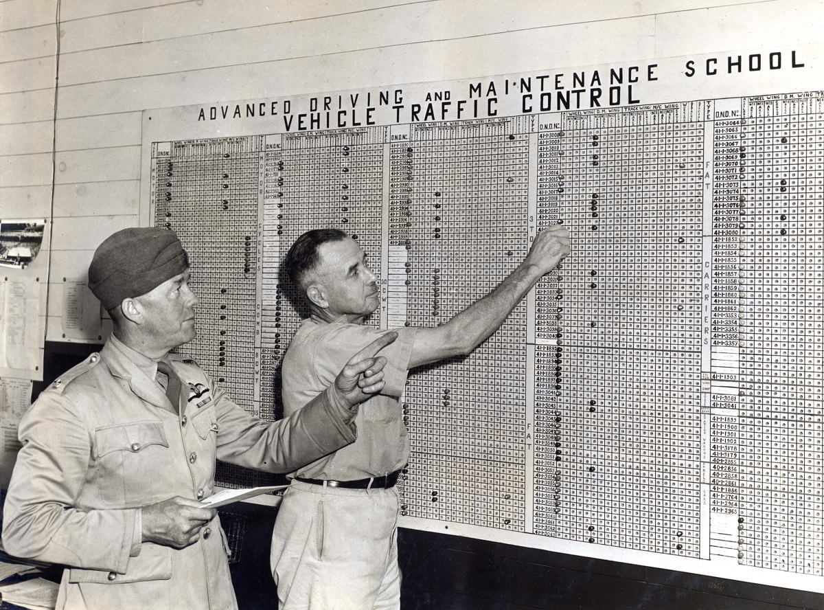 Examining the vehicle traffic control board at the Woodstock Advanced Driving and Maintenance School - circa 1940 - 1943. [COA93]