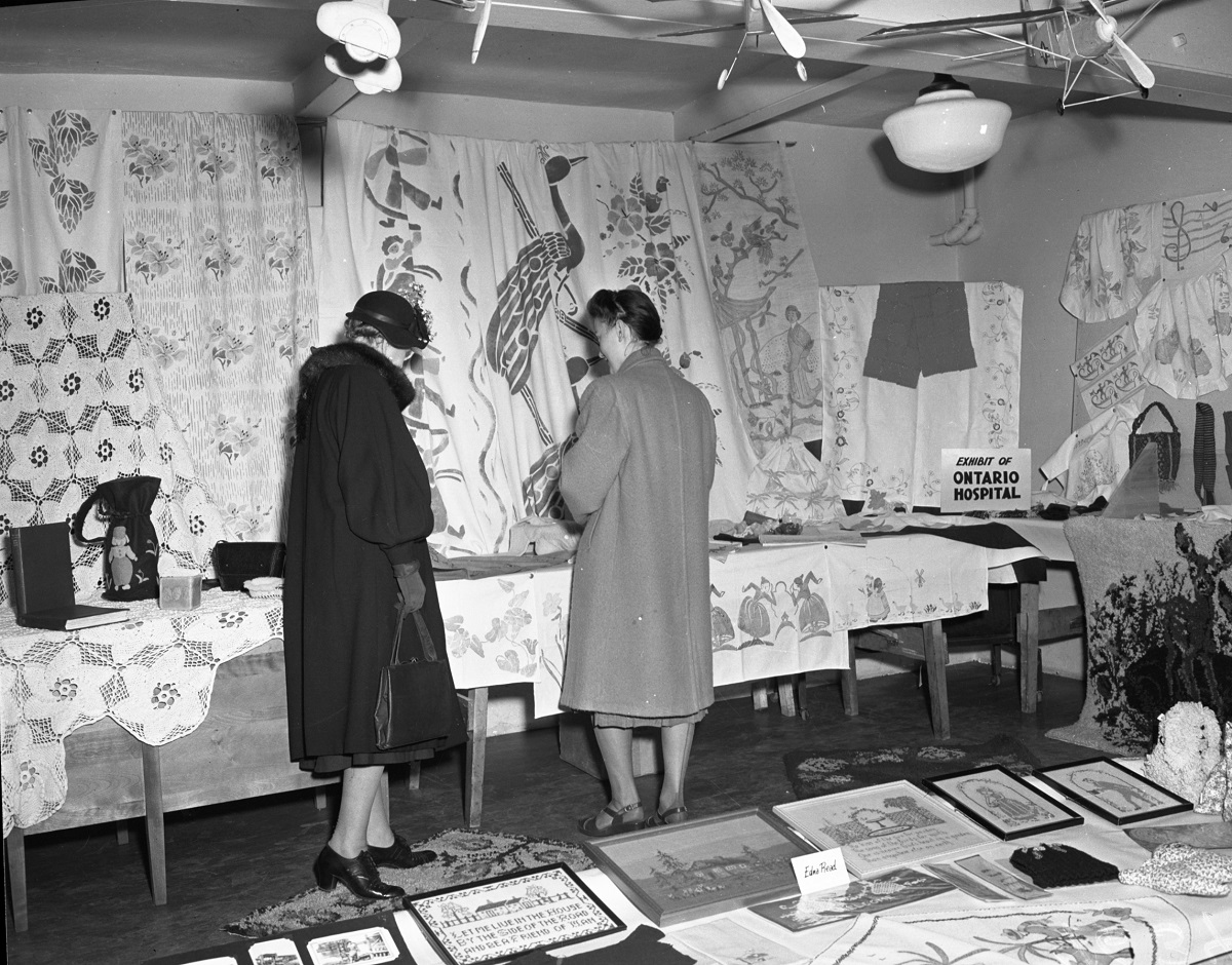 Two women looking at an exhibit prepared by the Ontario Hospital. [COA123 2-127]